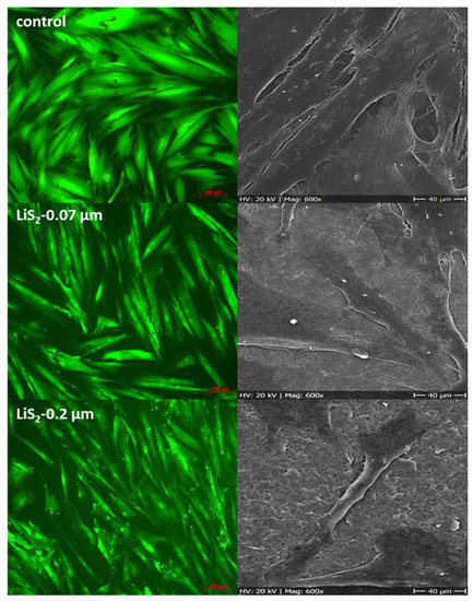 HGF-1 cells growing on lithium disilicate and on a control membrane (ThinCert™) at day 1 (left site = living/dead staining, magnification factor ×100, size bare 100 µm; right site = SEM, magnification factor ×600, size bare 40 µm).
