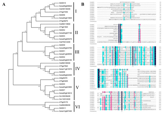 The phylogenetic relationship of tomato SlADK proteins, together with seven Arabidopsis AtADKs, twelve potato StADKs, and seven rice OsADKs, were examined by multiple sequence alignment with full lengths of the amino acid sequences (Table S2). Then, a phylogenetic analysis was conducted by MEGA7 based on the aligned results, and the neighbor-joining method was used with bootstrap replications of 1000. The ADK family was divided into six groups (Figure 1A). SlADK6 and 10, together with two potato homologs (Sotub09g006620 and Sotub04g013920), two Arabidopsis homologs (AT2g39270 and AT2g37250), and one rice homolog (Os03t0130400), were phylogenetically distinct and formed the predicted group I of plant ADKs. Group II contained two isoforms of potato (Sotub02g037180 and Sotub03g005270), one of Arabidopsis (AT3g01820), two of rice (Os08t0118900 and Os07t0412400), and two of tomato (SlADK2 and 3). Group III contained three evolutionarily similar subbranches: SlADK1 and Sotub01g028550; SlADK4 and Sotub03g020180; and SlADK9 and Sotub08g022760. Group IV contained two isoforms of potato (Sotub06g024300 and Sotub11g015570), one of Arabidopsis (At5g47840), one of rice (Os08t0109300), and one of tomato (SlADK8). Group V contained four subbranches: At5g50370 and At5g63400; SlADK5 and Sotub03g023880; SlADK7 and Sotub05g016010; and Os12t0236400 and Os11t0312220. At last, SlADK11, together with Sotub12g00740, Os08t0288200, and AT5g35170, formed group VI. Multiple sequence alignment of SlADK proteins was performed using DNAMAN8 software (Figure 1B). Because the amino acid sequence of SlADK11 was much longer than other proteins, the last comparison part, which contained only ADK11 C-terminal amino acids, is not shown in Figure 1B.