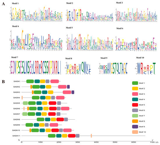Motif analysis revealed a total of 10 motifs (Figure 2A), with motifs 1, 2, and 4 shared by all SlADKs. In addition, motif 7 was unique to SlADK5 and 7 at the N-terminal, and motif 9 was unique to SlADK2 and 3 at the C-terminal (Figure 2B). Common motifs imply functional redundancy, and the specific motifs may contribute to functional divergence [29]. For the evolution of multiple gene families, the model of gene organization is very important [21]. Gene structure analysis revealed 4–19 exons in each SlADK (Figure 3A). All aforementioned genes in the same group (Figure 1A and Figure 3A left), such as SlADK1 and 9, SlADK2 and 3, and SlADK5 and 7, shared common motif compositions (Figure 2B) and similar gene structure (Figure 3A right). This correlation between gene structure and motif arrangement further confirmed the classifications of the SlADKs.