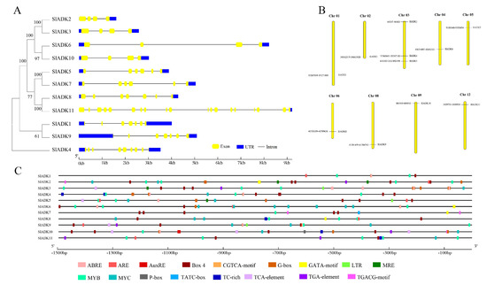 Gene organization plays a vital role in the evolution of multiple gene families [21]. A neighbor-joining phylogenetic tree constructed with MEGA7 is shown in Figure 3A, which is consistent with the result in Figure 1A. Corresponding to each gene, the genomic sequence and cDNA sequence information were submitted to the Gene Structure Display Server ((http://gsds.gao-lab.org/) (accessed on 7 August 2019) together to show the gene structure. Among these genes, the average gene length was 1610–9218 bp. SlADK 11 had the maximum number of exons and the longest gene length, while SlADK2 had the shortest gene length. Each gene had 4–19 exons, and the majority of SlADKs harbored four exons (SlADK2, 3, 6, and 10) (Figure 3A right, Table 1). The results also revealed that genes close to each other in the phylogenetic tree had similar gene structure, such as SlADK2 and 3, SlADK6 and 10, SlADK5 and 7, and SlADK1 and 9. Tomato contains 12 chromosomes; the 11 SlADKs were distributed on 9 of them randomly (Figure 3B). The majority of SlADKs were located on the proximate or distal ends of the chromosomes. Chromosome 03 had the greatest number of predicted SlADKs, with three (SlADK3–5), and no SlADK existed on chromosomes 07, 10, or 11. Only one SlADK existed on each of the other eight chromosomes.