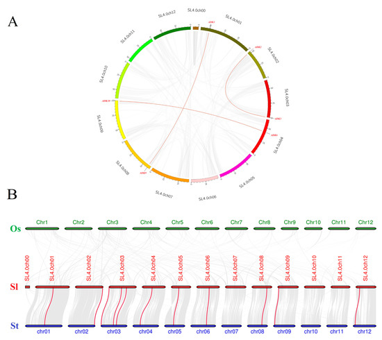 Collinearity analysis of ADK gene family. (A) Synteny analysis of the ADK family in tomato. The gray lines represent the collinearity result of the tomato genome, and red lines linking SlADK genes represent the duplication events occurring in the tomato ADK gene family. Chromosomes are drawn in different colors, and the approximate location of SlADK genes is shown by short black lines on the circle. (B) Synteny analysis of ADK genes between tomato and other two representative plant species. The gray lines in the background represent the collinear blocks within tomato and other plant genomes (potato, rice), while the red lines highlight the syntenic ADK gene pairs. Here the abbreviations “Os”, “Sl”, and “St” indicate Oryza sativa, Solanum lycopersicum, and Solanum tuberosum, respectively.