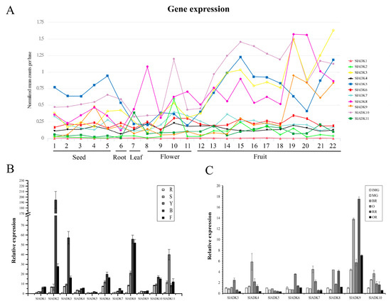 Comprehensive transcriptomic profiling of 11 SlADKs in tomato vegetative and reproductive tissues was carried out using the online TomExpress platform and associated data mining tools (http://gbf.toulouse.inra.fr/tomexpress (accessed on 12 August 2019)) (Figure 5A and Figure S1). Gene SlADK1 was seldom expressed in all tomato tissues. Genes SlADK5 and 10 showed higher expression in seed and root than other genes. The expression of SlADK10 was enhanced at the flowering and fruit stages and reached the highest level at the stages of bud at 3 mm and mature green fruit (35 DPA). The expression of SlADK5 was enhanced at the onset of fruit development and reached maximum at mature green fruit (35 DPA); however, during ripening, its expression decreased before increasing again during the red fruit stage. Some genes such as SlADK2 and 6 exhibited relatively moderate expression in all tissues. Of particular interest, SlADK3, 8, and 9 were the most highly expressed during late fruit ripening, displaying a net upregulation at the onset of ripening starting after the mature green stage. This pattern of expression suggests a potential role of these genes in regulating the ripening process.