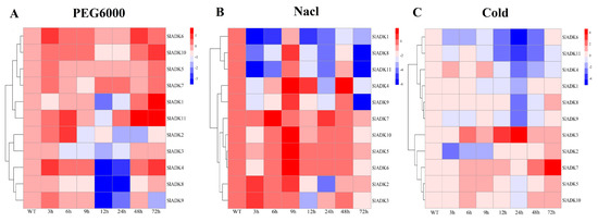 qRT-PCR expression analysis for 11 SlADKs in tomato leaves under diverse abiotic stresses: (A) PEG6000; (B) NaCl; (C) cold. The treated tomato leaves were harvested at the indicated time points. The color scale represents the log2 mean value of relative expression levels from three independent biological replicas (n = 3). Used primers specific for SlADKs are listed in Supplementary Materials Table S5.