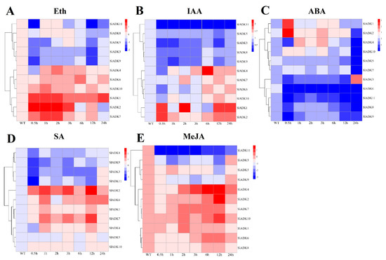 Previous evidence indicated that different hormones play important roles in stress signal transduction and cell responses [22,23,24]. Here, we investigated the expression profiles of SlADKs in response to Eth, IAA, ABA, SA, and MeJA treatments (Figure 7). With Eth treatment, in general, the expression of most SlADKs showed little difference, but that of SlADK1, 2, and 7 increased gradually to different levels during 0–2 h (Figure 7A). With IAA treatment, the expression maxima of SlADK1, 2, and 4 were at 2, 0.5, and 6 h, respectively. Interestingly, SlADK11 showed decreased transcription at the early stage and almost no expression at later time points (Figure 7B). At 0.5 h after ABA treatment, expression of SlADK5, 7, and 10 showed no significant differences; however, expression of SlADK3, 4, 6, 8, 9, and 11 decreased, and that of SlADK1 and 2 increased at the first time point. Moreover, most SlADKs did not change significantly after 1–12 h of treatment. SlADK6 showed decreased transcription at the early stage and almost none at following time points (Figure 7C). With SA treatment, transcription of most SlADKs was repressed in the first 0.5 h. Expression of most SlADKs showed mild change under SA treatment, except for SlADK2, 6, and 7. SlADK2 and 7 showed especially similar expression patterns throughout all time points, with maximum expression at 12 h (Figure 7D). The plant regulator MeJA mediates diverse developmental processes and defense responses. It rapidly induced upregulation of SlADK4 and 2 during 1–6 h and 3–12 h time points, respectively. Expression of SlADK6 increased gradually during 1–6 h, with opposite results for expression of SlADK9 during 0–3 h. As in IAA treatment, SlADK11 showed decreased transcription at the early stage and almost no expression for later time points (Figure 7E). Hence, transcription of SlADKs was responsive to most of the applied stress treatments. Interestingly, SlADK2 and 4 exhibited significant changes under multiple hormone treatments, suggesting that they may have unique roles in hormone regulation. Notably, the result of gene clustering showed that the homologous genes of SlADK6 and 10 had similar expression patterns under treatment with Eth and IAA (Figure 3A left and Figure 7A,B), and SlADK8 and 11 had similar expression patterns under treatment with Eth and ABA (Figure 3A left and Figure 7A,C).