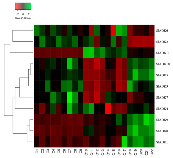 As introduced above, TomExpress provides a unified and standard method to judge tomato gene expression from released RNA-Seq data sets. Here, SlADKs expression patterns under treatment with different plant hormone and multiple hormones were analyzed (Figure 8 and Figure S2). In general, the expression of most SlADKs (SlADK3, 5, 6, 7, and 10) were lower in leaves (C10 to C17) than in roots (C1–C2, C4–C5, C7–C8) whether these tissues were treated with cytokinin or not. Also, the expression of SlADK1 was lower in many tissues, and even could not be detected in roots (C2, C4, C5, C7) and leaves (C10, C13, C16) under special stress conditions. With the treatment of auxin in tip of roots, the expression of SlADK7 and 10 were downregulated significantly. In fruit, several SlADK genes such as SlADK3, 5, 8, and 10 displayed higher expression levels. Compared with treatment of ACC in fruit, multiple-hormone treatment of ACC + IAA could upregulate the expression of SlADK3 and 5 (Figure S2). Heatmap can be very convenient to show gene clustering. As shown in Figure 8, under treatment with different plant hormone and multiple hormones, SlADK3, 4, 5, 7, and 10 showed similar expression patterns in many tissues, as did the groups of SlADK2, 6, and 11 and of SlADK1, 8, and 9 (Figure 8).