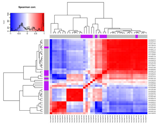 Correction heatmap of SlADK genes. Based on the calculation of the correlation values, correlation gene pairs were visualized as a heatmap after a hierarchical clustering to highlight the positively and negatively correlated groups. For a given row of the heatmap, red and blue colors represent positive and negative correlation coefficients, respectively. Purple colors represent SlADK family members. The diagonal line from the lower left corner to the upper right corner of the heat map shows the same gene, and the default correlation coefficient is 1.