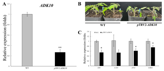 Suppression of SlADK10 leads to drought sensitivity in tomato. (A) Detection of SlADK gene expression after virus-induced gene silencing (VIGS). (B) Phenotype of TRV2-ADK10 and wild-type plants under PEG6000 treatment for 24 h. pTRV2-ADK10 showed more obvious wilting symptoms under simulated drought conditions. (C) The qRT-PCR analysis of the plant stress-related genes (ER5, CAT3, APX2, GME2) in ADK10-silenced and WT plants under PEG6000 treatment for 24 h. From three independent biological replicas, data are represented as mean value ± standard error. “*” indicates significant differences between pTRV2-ADK10 and WT plants with p < 0.05, as determined by Student’s t-test.