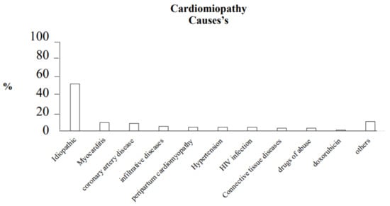 Dilated cardiomyopathy is one of the main causes of heart failure. Its prevalence, in the population with heart failure, is 1:250–400 patients, in the general population it is 1:2500 patients. The incidence of dilated cardiomyopathy is 7 cases per 100,000 people per year [6,7]. In addition, in the 1990s, idiopathic dilated cardiomyopathy was indicated as the leading cause of heart transplantation in the United States of America [8]. In the pediatric population, dilated cardiomyopathy accounts for 60% of cardiomyopathies, and children under 12 months have the highest incidence [9,10]. A study by Falker et al., published in the NEJM in 2000, analyzed the possible causes of dilated cardiomyopathy in 1230 affected patients and showed these percentages [11].