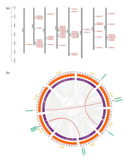 Chromosomal distribution and duplication events of MsGRAS proteins. (a) The tandem duplicated genes are marked by black arc trajectory. (b) The segmentally duplicated genes are connected by red lines, referring to the ten genes highlighted in green.