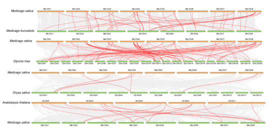 Syntenic analysis of MsGRAS genes in M. sativa in comparison with those in four plant species (M. truncatula, G. max, O. sativa, and A. thaliana).