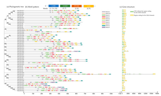 Phylogenetic relationship, motif pattern, and gene structure of MsGRAS genes. (a) Phylogenetic tree of MsGRAS was constructed based on the full-length sequences of proteins using MEGA-X [34] based on the neighbor-joining (NJ) method. Bootstrap values for 1000 replicates were shown above the lines. (b) The motifs of M. sativa GRAS proteins predicted by MEME and plotted in TBtools. The motifs of 1–10 are displayed in different colored boxes. The protein length can be estimated using the scale at the bottom. The schematic of four conservative domains at the C-terminal regions of the MsGRAS members was combinations of motifs. (c) Gene structure of MsGRAS genes. Region coding for the GRAS domain (yellow) was determined in Batch Web CD Search Tool (BWCDST) on the NCBI website and plotted in TBtools software. “CDS without the region coding for the GRAS domain” (green), where the coding region does not cover the GRAS domain, are plotted based on the alfalfa genome annotation. gff file, which was input into TBtools together with hit export from BWCDST.