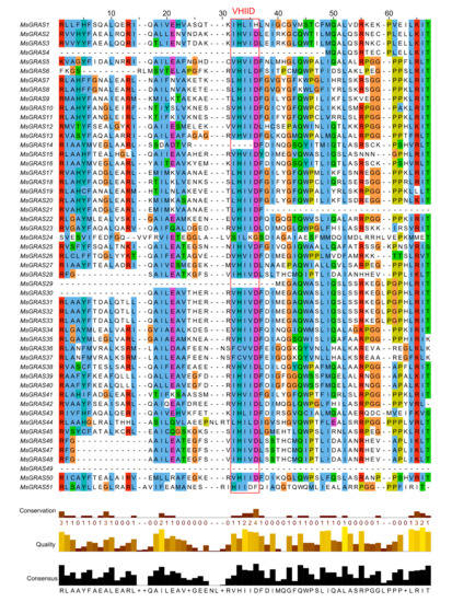 VHIID domain of 51 MsGRAS proteins based on sequence alignment. The most conserved GRAS domain of VHIID was boxed in red.