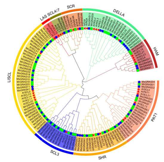 To fully uncover the evolutionary history of the GRAS gene family in alfalfa, 51 MsGRAS genes were compared with 32 and 59 GRAS genes in Arabidopsis (https://www.arabidopsis.org/index.jsp accessed on 5 October 2020) and M. truncatula (http://www.medicagohapmap.org/ accessed on 5 October 2020), respectively, and an unrooted phylogenetic tree was constructed using the neighbor-joining method in MEGAX. Based on the phylogenetic tree (Figure 5), all 51 MsGRAS proteins could be grouped into 9 subfamilies (SCL3, HAM, DELLA, SCR, LAS, LISCL, SHR, PAT1, and SCL4/7), which is consistent with the previous studies on A. thaliana [9] and M. truncatula [13]. A total of 4, 2, 10, 2, 1, 16, 7, 8, and 1 MsGRAS genes corresponded to subfamilies of SCL3, HAM, DELLA, SCR, LAS, LISCL, SHR, PAT1, and SCL4/7, respectively (Figure 5). The LISCL subfamily herein contained 16 members and was the largest MsGRAS gene subfamily in this study.