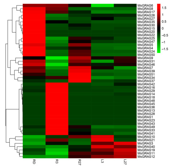 Gene expression profiles of GRAS members in M. sativa. R3/L3/27: The roots (R) or leaves (L) were treated for 3 or 27 h under salinity stress; RD: Roots under drought stress. The color scale represents log10 expression values.