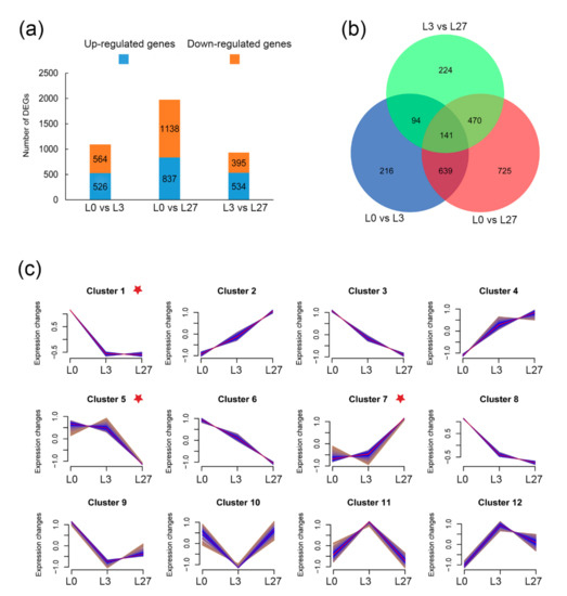 Analysis of differential expression and cluster analysis under salt stress in M. sativa. (a) Comparisons of DEGs in alfalfa leaf tissue in response to salinity stress. The blue means up-regulation, orange means down-regulation. (b) Venn diagram of DEGs in three comparisons. L0 is the control group of leaf and L3 and L27 indicate salinity treatments on a leaf for 3 and 27 h, respectively. (c) Clustering of DEGs. A total of 12 clusters were achieved, and 6 MsGRAS genes were found in three ones, labeled with a red star.