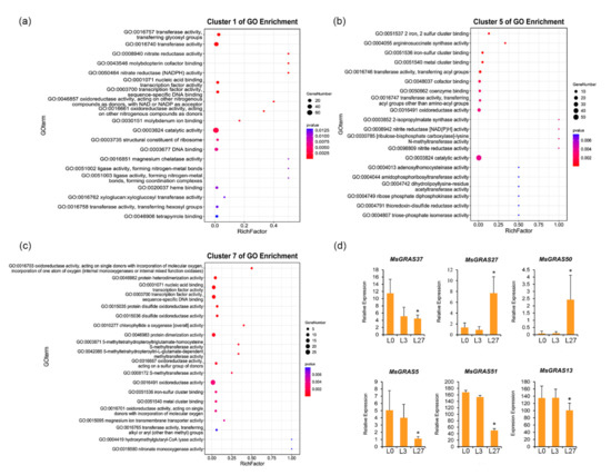 GO enrichment analysis of DEGs shared by clusters of 1, 5, 7 and the relative expression of MsGRAS genes of #5, 13, 27, 37, 50, 51. (a) Cluster 1 of GO enrichment. (b) Cluster 5 of GO enrichment. (c) Cluster 7 of GO enrichment. (d) Expression profiles of MsGRAS genes of #5, 13, 27, 37, 50, 51 from RNA-seq data (* p < 0.05, Student’s t-test).