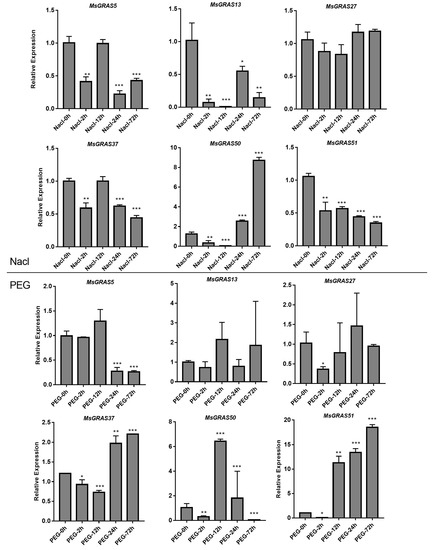 Among all 51 MsGRAS genes, expressions of 6 (MsGRAS5, MsGRAS13, MsGRAS27, MsGRAS37, MsGRAS50, and MsGRAS51) were highly induced by salinity and drought stresses. We designed primers for the six selected genes and conducted qRT-PCR experiments in leaf tissues (Table S6). The gene expression profiles of the six selected genes were generally consistent with the RNA-seq data (Figure 8d and Table S7). The results showed that upon salinity treatment, MsGRAS50 expression was significantly induced (p < 0.01), while the other four MsGRAS genes’ expression was down-regulated significantly. Under drought stress, the expression of MsGRAS51 increased gradually. After 72 h of treatment, MsGRAS51 expression was about 20 times that of the control, implying its putative roles in stress tolerance. Interestingly, the expression of three genes (MsGRAS5, MsGRAS13, and MsGRAS50) were only up-regulated at 12 h. However, MsGRAS27 showed no significant influence in both salt and drought treatment (Figure 9).
