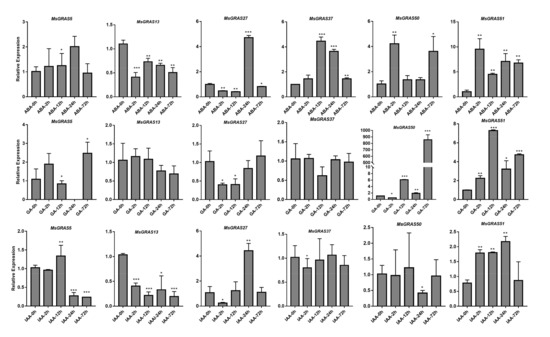 Expression of MsGRAS genes in response to three hormones of ABA, GA, and IAA. Expression levels are normalized to Ms-ACTIN, and error bars indicate standard deviation among three biological replicates. Asterisks indicate the corresponding genes were significantly up-regulated or down-regulated compared with the control (* p < 0.05, ** p < 0.01, *** p < 0.001; Student’s t-test).