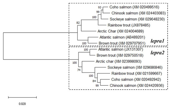 The BLAST analyses using the lepra1 and lepra2 nucleotide sequences from Atlantic salmon (S. salar, [30]; AB489201 and JX131307, respectively) revealed six predicted leptin receptor-like sequences in other salmonids of high similarity. The receptors show 95–99% sequence identity to S. salar lepra2 and 85–87% to the lepra1 paralog of that species; rainbow trout (O. mykiss; JX878485 and XM_021599667), Arctic char (S. alpinus; XM_024004689 and XM_023998093), coho salmon (Oncorhynchus kisutch; XM_020499516 and XM_020492942), sockeye salmon (Oncorhynchus nerka; XM_029648230 and XM_029686846), chinook salmon (Oncorhynchus tshawytscha; XM_024403083 and XM_024420936), and brown trout (Salmo trutta; XM_029707951 and XM_029750518). When phylogenetic analyses were performed on the 14 salmonid leptin receptor nucleotide sequences, two distinct clades were formed, which were then identified for each lepr paralog (Figure 1).