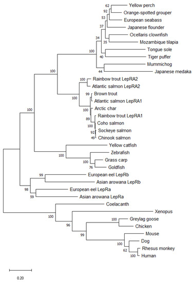 These studies have identified a duplicated leptin receptor, LepRA2, in rainbow trout and investigated the physiological responses of both leptin receptor paralogs to feed deprivation. In those vertebrates where a leptin receptor has been characterized, virtually all have only a single leptin receptor, including most teleost fishes where many genes have second copies due to genome duplication [16,28,29]. The LepRA2 paralog appears in the six other species of salmonids examined and they share a nucleotide sequence identity of 95–99% to that of Atlantic salmon LepRA2. There is greater divergence between paralogs as rainbow trout LepRA1 and LepRA2 amino acid sequences have 77.1% similarity. The primary sequence conservation with human LepR is low for both paralogs at 30.8% and 32.2% for trout LepRA1 and LepRA2, respectively, however the predicted receptor domains appear to be highly conserved. The phylogenetic analyses completed with the nucleotide sequences show two distinct clades formed for each of the leptin receptor paralogs in salmonids. Similarly, comparisons of amino acid sequences of leptin receptors show that the salmonid LepRA2 paralogs group separately from all LepRA1 and the LepRb paralogs of eel and arowana, suggesting the appearance of LepRA2 is likely due to the 4R salmonid specific genome duplication event [30,31]. Synteny analyses from another study proposed the eel LepRb was resultant from the teleost 3R genome duplication event and was subsequently lost in the teleost lineage [29]. While it remains to be evaluated fully, the retainment of the LepRb paralog is likely a similar case for the Asian arowana, with LepRa and LepRb protein sequences of the arowana and the eel grouping together respectively in the phylogenetic tree in Figure 2 and are notably separate from the salmonid LepRA2 node and LepRA1 of other teleost fish.