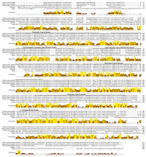 The amino acid sequences for the duplicated LepR in Atlantic salmon (S. salar: BAI23197 and NP_001315080), rainbow trout (O. mykiss: XP_021460283 and XP_021455342), Asian arowana (S. formosus: XP_018609810 and KPP63040), European eel (A. Anguilla: CEE15397 and CEE15398, [29]), were analyzed along with 27 other LepR protein sequences including 5 salmonids (Arctic char: XP_023860456, coho salmon: XP_020355105, sockeye salmon: XP_029504090, chinook salmon: XP_024258849, and brown trout: XP_029563811), a range of 15 additional species of fishes (zebrafish: AAY16198, Japanese medaka: BAH24203, Mozambique tilapia: AGT28753, clown anemonefish: XP_023146279, tiger puffer: BAG67079, mummichog: JAR68227, orange-spotted grouper: AFU55262, European seabass: AIB06819, yellow perch: XP_028442652, yellow catfish: AFO67946, grass carp: AFU35431,tongue sole: ARX70259, Japanese flounder: XP_019953845, goldfish: XP_026120678, and coelacanth: XP_006009523), and 7 tetrapods represented by amphibian, mammals, and birds (clawed frog: XP_018116241, chicken: BAA94292, greylag goose: AEE61372, mouse: AAC52705, dog: NP_001019805, rhesus monkey: NP_001027991, and human: AAA93015). The phylogenetic tree generated using these 35 sequences exhibits initial branching for tetrapods and teleosts, with coelacanth LepR showing closer relation to tetrapods. The teleost node has branching for more ancient fishes (eel and arowana) and the rest of the teleosts split into different multiple clades; for cyprinids and catfish, for more highly derived teleosts (i.e., pufferfish, tilapia, etc.), and for salmonids (Figure 2). Where present, the duplicated leptin receptor paralogs cluster together in their respective clades. The amino acid sequence alignment of rainbow trout LepRA1 and LepRA2 shows high conservation between paralogs and with Atlantic salmon LepRA2 (Figure 3). Rainbow trout LepRA1 and LepRA2 paralogs share a 77.1% amino acid sequence identity, while trout LepRA2 is 92.8% similar to Atlantic salmon LepRA2. Primary sequence conservation with human LepR are low for both paralogs at 30.8% and 32.2% for trout LepRA1 and LepRA2, respectively. However, predicted receptor domains remain conserved (Leptin Receptor: IPR015752). Extracellular domains (amino acids 1–788) include 3 fibronectin type 3 domains (IPR003961; 182-266, 484-566, 683-773), one immunoglobulin C2-set-like ligand-binding domain (IPR010457; 284-357), and one LepR immunoglobulin-like domain (IPR041182; 376-480). The transmembrane domain spans amino acids 789-811, while the cytoplasmic, intracellular domain ranges from amino acids 812-1119.