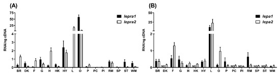 lepra1 was most highly expressed in the ovaries, at over 50× higher than lepra2. lepra1 was expressed near 5× higher levels in the stomach and white muscle compared to lepra2. Interestingly, hepatic lepra1 levels were low while lepra2 was at levels over 17× higher. lepa1 mRNA expression was highest in the liver with some lower levels in the brain, fat, gills, heart, hypothalamus, ovaries, pituitary, muscle, and no detectable expression in other tissues examined. Likewise, lepa2 had the highest levels in the liver with low levels in most other tissues except fat and ovaries where transcript abundance was 2× and 7× higher than lepa1 (Figure 4B).