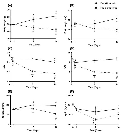 Rainbow trout were feed deprived for 14 days and compared to fed controls. (A) body weight (g), (B) fork length (cm), (C) blood glucose (mg/dL), (D) hepatosomatic index (HSI), (E) viserosomatic index (VSI), and (F) plasma leptin (ng/mL). Values reported as means ± SEM. # denote significant differences from time 0 within each treatment. * denote significant differences between treatments within each time point. (n = 9–12, except weight and length n = 16–84; * p ≤ 0.02, ** p ≤ 0.005, *** p ≤ 0.001).