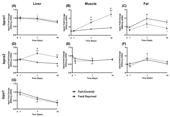 Rainbow trout were feed deprived for 14 days and compared to fed controls. mRNA levels of lepra1 in (A) liver, (B) white muscle, (C) fat, and levels of lepra2 in (D) liver, (E) white muscle, (F) fat, and lepa1 in (G) liver, were determined by qPCR. Values were normalized to the total nanograms of RNA used in cDNA synthesis and are expressed as the mean fold change from the baseline at T = 0 ± SEM (n = 9–12, * p ≤ 0.04, *** p ≤ 0.001). # denote significant differences from time 0 within each treatment. * denote significant differences between treatments within each time point.