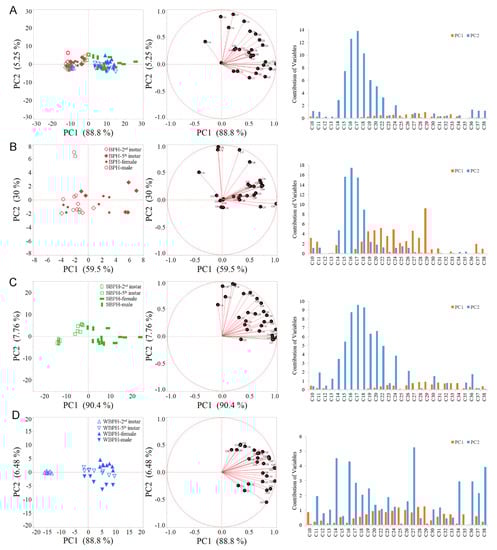 Principal component (PC) biplots for PC1 and PC2 of CHCs in the three planthopper species. (A) second- and fifth-instar nymphs and female and male adults of Nilaparvata lugens (BPH), Laodelphax striatellus (SBPH) and Sogatella furcifera (WBPH). (B) second- and fifth-instar nymphs and female and male adults of BPH. (C) second- and fifth-instar nymphs and female and male adults of SBPH. (D) second- and fifth-instar nymphs and female and male adults of WBPH. Left: The PCA shows PC1 and PC2 with the explained variance in brackets. Different groups are color-coded. Mid: eigenvectors of PC1 and PC2. Right: contribution of n-alkanes to PC1 and PC2 separation.