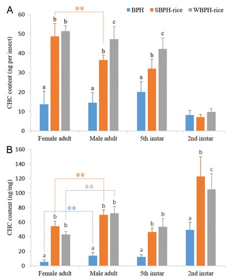 CHC contents of BPH, SBPH and WBPH at second- and fifth-instar and female and male adult stages. The contents of total straight-chain alkanes were analyzed by GC/MS. The results were calculated from ten biological replicates ((A): nanograms per insect ± SE, (B): nanograms per milligram of fresh body mass ± SE). Different letters above the error bars indicate significant difference among the stage group (ANOVA, LSD, p < 0.05). ** p < 0.01 (Student’s t-test).