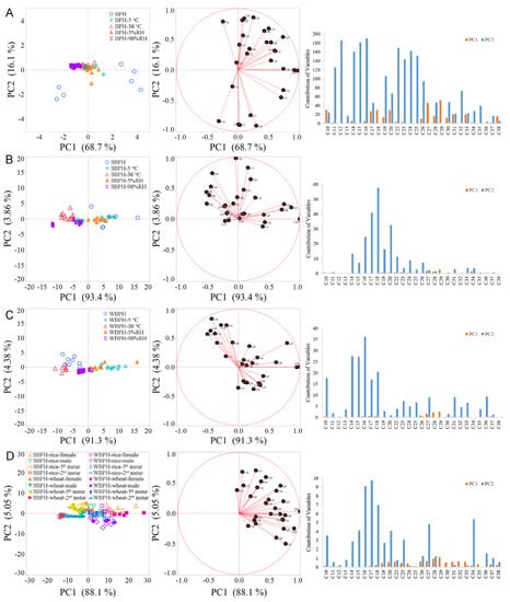 Principal component (PC) biplots for PC1 and PC2 of CHCs in the three planthopper species under different environmental conditions. (A) Nilaparvata lugens (BPH) in low/high temperature and humidity. (B) Laodelphax striatellus (SBPH) in low/high temperature and humidity. (C) Sogatella furcifera (WBPH) in low/high temperature and humidity. (D) wheat- and rice-feeding SBPH and WBPH at different stages. Left: the PCA shows PC1 and PC2 with the explained variance in brackets. Different environmental groups are color-coded. Mid: eigenvectors of PC1 and PC2. Right: contribution of n-alkanes to PC1 and PC2 separation.