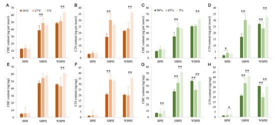 CHC contents of BPH, SBPH and WBPH treated with different temperatures (A,B,E,F) and humidity (C,D,G,H). The contents of total straight-chain alkanes and C29 were analyzed by GC/MS. The results were calculated from ten biological replicates (nanograms per insect or milligram of fresh body mass ± SE). * p < 0.05, ** p < 0.01 (Student’s t-test).