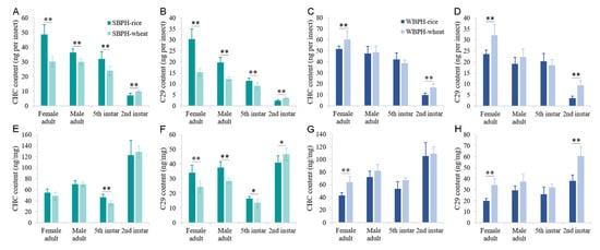 CHC contents of wheat- and rice-feeding SBPH (A,B,E,F) and WBPH (C,D,G,H) at different stages. The contents of total straight-chain alkanes and C29 were analyzed by GC/MS. The results were calculated from ten biological replicates (nanograms per insect or milligram of fresh body mass ± SE). * p < 0.05, ** p < 0.01 (Student’s t-test).