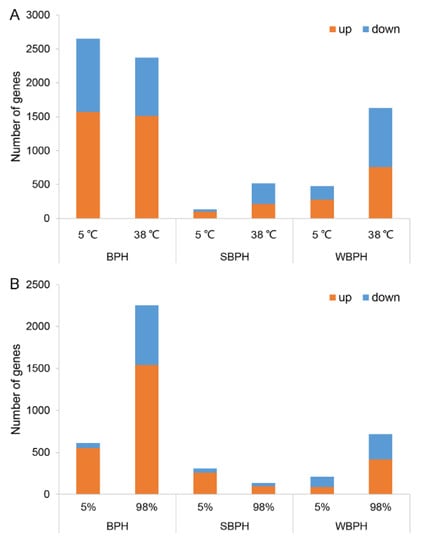 Number of differentially expressed genes in three planthoppers under 5 °C or 38 °C (A) and 5% or 98% relative humidity (B) compared with that at 27 °C with 65% RH, respectively. Up- (orange) and down-regulated (blue) unigenes were quantified.