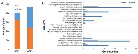 Comparative analysis of the transcriptomes between wheat- and rice-feeding SBPH and WBPH. (A) Number of differentially expressed genes in planthoppers feeding on different plants. (B) GO functional terms of differentially expressed genes in planthoppers feeding on different plants attributed to CHC biosynthetic pathways.