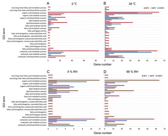 For high relative humidity, the results of GO enrichments were similar to those of BPH and WBPH under the high temperature, while no genes were enriched to the cuticular lipid biosynthetic pathway gene set in SBPH (Figure 8C). For the low relative humidity, there were fewer genes correlated with cuticular lipid biosynthesis enrichment (Figure 8D).