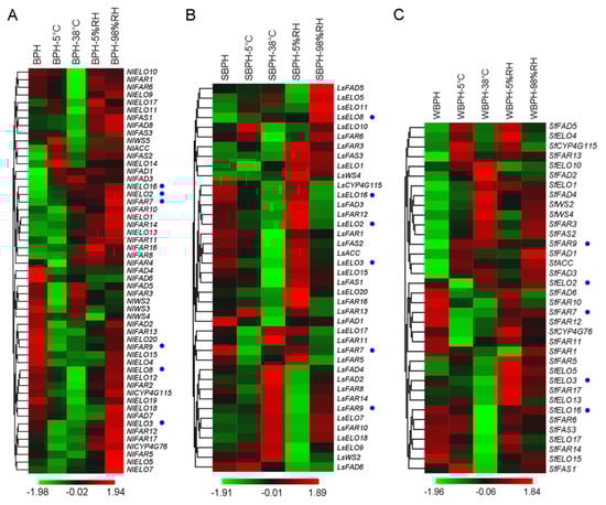 The expression profiles of cuticular lipid biosynthetic pathway genes in BPH (A), SBPH (B) and WBPH (C) under different treatments. The previous verified functional genes were indicated by blue dots.