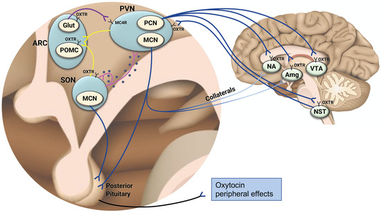 To date, multiple studies have looked at the association between peripheral oxytocin levels and metabolic outcomes of interest as a proxy for oxytocin central effects on appetite regulation, energy expenditure, and metabolism. It is unclear, however, if peripheral oxytocin levels in humans accurately reflect oxytocin central activity. As discussed previously, oxytocin is released within the brain and to the peripheral circulation via separate, independent pathways, each associated with a different time scale of action. More specifically, oxytocin release from the magnocellular PVN and SON neurons to the periphery via the posterior pituitary occurs through axonal projections and is instantaneous while magnocellular somato-dendritic secretion and diffusion of oxytocin within the brain is slower and occurs over minutes [19]. The existence of these two mechanisms suggests that at least some oxytocin central activity (i.e., the activity mediated by dendritic release) is not temporally synchronized with oxytocin peripheral activity. In contrast, centrally injected alpha-melanocyte stimulating hormone (alpha-MSH), which has a pivotal role in inducing satiety, acts on SON oxytocin receptors expressing alpha-MSH receptors to directly stimulate central oxytocin dendritic release while simultaneously suppressing electrical activity of oxytocin cells and thus the secretion of oxytocin into the systemic circulation [67]. Very recently, a meticulous description of oxytocin connectivity has been achieved in rodents using state-of-the-art engineered viral tracers [26]. This study showed that a subset of magnocellular oxytocin neurons collaterally and simultaneously projects to both the posterior pituitary and additional brain areas involved in reward and reinforcement-based learning behaviors (e.g., the amygdala, dorsal striatum, lateral septum, and NAc) [26] (Figure 1). Chemogenetic activation of these neurons provoked central oxytocin release to regulate social interactions and locomotion concurrently with elevation in peripheral oxytocin release [26]. In conclusion, the neurocircuitry of oxytocin supports both coordinated and non-coordinated central and peripheral activity.