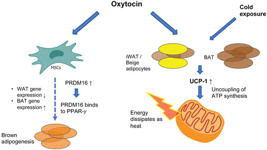 The OXTR is highly expressed in white adipose tissue (WAT) [80] and to a lesser extent in brown adipose tissue (BAT) [81], where it promotes increased energy expenditure by stimulating BAT thermogenesis and promoting WAT browning (see Figure 2). Chronic intracerebroventricular (ICV) administration of oxytocin to diet-induced obese male rats and mice increases BAT temperature and this effect is abolished when animals receive pre-treatment with an OXTR antagonist [82,83]. Similarly, chronic subcutaneous oxytocin treatment in male mice exposed to cold temperatures increases core body temperature [81]. The molecular mechanism through which oxytocin induces these changes has been revealed recently. Oxytocin is an adipocyte browning inducer—in vitro treatment of pluripotent C3H10T1/2 stem cells with oxytocin suppresses the expression of white-adipose selective markers (Nnmt and Retn) while increasing the expression of thermogenic genes (e.g., Cidea, Ppargc1a, Dio2 and Elovl3) which are considered as brown adipocyte-selective markers [81]. Among these genes is uncoupling protein-1 (UCP-1), a mitochondrial membranous protein that is uniquely expressed in brown adipocytes and has a pivotal role in BAT adaptive thermogenesis. UCP-1 promotes proton translocation through the inner membrane of brown adipocyte mitochondria, thus diverting respiration from ATP synthesis to energy dissipation in the form of heat [84]. UCP-1 is also present in beige adipocytes, which reside within the WAT depot, mostly in inguinal WAT (iWAT) in rodents. Beige adipose tissue also participates in thermogenesis in response to specific cues (e.g., cold exposure or adrenergic signaling) [85]. Exposure of mice to cold temperatures induces an increase in hypothalamic oxytocin and adipose-tissue OXTR expression [81], and ablation of hypothalamic oxytocin neurons results in impaired thermogenesis in response to cold exposure which is rescued with oxytocin treatment [86]. In vivo, oxytocin enhances the expression of UCP-1 in both mice and rat BAT and iWAT, thus promoting thermogenesis [81,83]. Oxytocin also up-regulates PRDM16, which is a transcription factor that promotes BAT formation by binding to peroxisome-proliferator-activated receptor-gamma coactivator 1 alpha (PPAR-gamma, or Pgc-1 alpha) and inducing brown adipogenesis from progenitor myoblasts in C3H10T1/2 stem cells [87]. PRDM16 has also been shown to suppress white-adipocyte selective genes in BAT [88]. In PRDM16-deficient mice, oxytocin-induced increase in UCP-1 was significantly attenuated [81], suggesting that oxytocin-induced adipocytes browning is mediated by PRDM16.