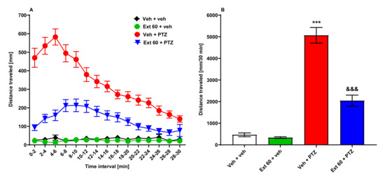 The influence of Zingiber officinale rhizoma methanolic extract on seizure-like behavior in the PTZ-induced hyperlocomotion assay in zebrafish. After 24 h incubation in Zingiber officinale rhizoma methanolic extract (60 µg/mL), 7-day-old zebrafish larvae were exposed to an acute dose of PTZ (20 mM). Larval behavior was assessed 5 min after PTZ application. Results of the experiment are depicted as: (A) distance covered by larvae in 2 min long time bins, and (B) total distance covered by larvae during 30 min of the assay. Data were analyzed using one-way or two-way ANOVA with repeated measures followed by Tukey’s or Bonferroni’s post hoc test, respectively. Data are depicted as a mean ± standard error of the mean (SEM). Veh + veh (n = 31), Ext 60 + veh (n = 24), Veh + PTZ (n = 48), Ext 60 + PTZ (n = 48). *** p < 0.001 vs. Veh + veh; &&& p < 0.001 vs. Veh + PTZ. Ext 60—Zingiber officinale methanolic extract (60 µg/mL), PTZ—pentylenetetrazole, Veh—vehicle. n—refers to the total number of larvae.