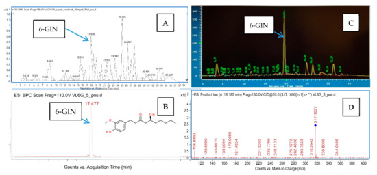 The chromatograms and fragmentation spectra obtained for the total extract and the isolated 6-GIN. (A) the total ion chromatogram of the methanolic extract from Zingiber officinale rhizome recorded in the positive ionization mode; (B) the total ion chromatogram of the isolated 6-GIN recorded in the positive ionization mode; (C) the chromatogram from the semipreparative HPLC, recorded at 290 nm; and (D) the MS/MS fragmentation spectrum of 6-GIN.