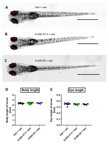 Larvae treated with 6-GIN are morphologically indistinguishable from their Veh-treated counterparts. (A) Larva treated with Veh for 24 h (n = 9). (B) Larva treated with 37.5 µM 6-GIN for 24 h (n = 11). (C) Larva treated with 50 µM 6-GIN for 24 h (n = 11). (D) Comparison of body length of Veh- and 6-GIN-treated larvae (E) Comparison of eye length of Veh- and 6-GIN-treated larvae. Red dash lines represent how eye length was measured, scale bar = 1 mm. 6-GIN—6-gingerol, Veh—vehicle.