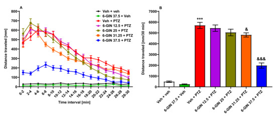 Next, 6-day-old larval zebrafish were incubated for 24 h with different doses of 6-GIN (12.5, 25, 31.25 or 37.5 µM) or Veh and subsequently exposed to an acute dose of PTZ (20 mM). Statistical analysis conducted with two-way ANOVA with repeated measures showed differences among tested groups of zebrafish larvae (group: F(6, 341) = 99.86, p < 0.001; time point: F(14, 1378) = 214.60, p < 0.001; group × time point interaction: F(84, 4774) = 23.05, p < 0.001; n = 37–64/group; Figure 4A). Moreover, one-way ANOVA of total distance traveled revealed the differences among groups (F(6, 341) = 99.86, p < 0.001; n = 37–64/group; Figure 4B). Here, Tukey’s post hoc test showed that 6-GIN in a dose of 31.25 and 37.5 µM decreased PTZ-induced hyperlocomotor activity (p < 0.05 and p < 0.001, respectively). The two lower doses of 6-GIN (i.e., 12.5 and 25 µM) did not affect PTZ-induced hyperlocomotor activity (p > 0.05) as compared to only PTZ-treated animals. The 6-GIN (37.5 µM) itself did not influence the larval activity (p > 0.05, Figure 4A,B).