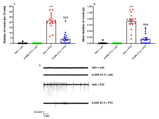 LFP events detected from the optic tectum of 7-day-old zebrafish larvae pre-exposed for 24 h to 6-GIN (37.5 µM). Subsequently, each larva was incubated with 20 mM PTZ or Veh for 5 min, before being mounted in agarose for LFP recordings. Data are shown as: (A) the number of events (nr/20 min), and (B) the mean duration of events (s/20 min). Data were analyzed using one-way ANOVA followed by Tukey’s post hoc test. Data are depicted as mean ± SEM. Veh + veh (n = 8), 6-GIN 37.5 + Veh (n = 6), Veh + PTZ (n = 14), 6-GIN 37.5 + PTZ (n = 16). *** p < 0.001 vs. Veh + veh; &&& p < 0.001 vs. Veh + PTZ. (C) Representative traces of recordings. 6-GIN—6-gingerol, PTZ—pentylenetetrazole, Veh—vehicle. n—refers to the total number of larvae.