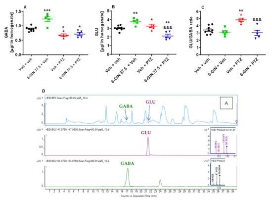 Determination of (A) GABA, (B) GLU, (C) GLU/GABA ratio, and (D) the total ion chromatogram (A) of the water: acetonitrile extract from zebrafish larvae with extracted ion chromatograms and MS/MS spectra of GLU and GABA in 7-day-old zebrafish larvae by HPLC-MS. After a 24 h incubation in 6-GIN (37.5 µM), zebrafish larvae were exposed to an acute dose of PTZ (20 mM) for 90 min. Next, whole zebrafish larvae were collected in a pool of n = 100/sample. Data were analyzed using one-way ANOVA followed by Tukey’s post hoc test. Data are depicted as mean ± SEM. Veh + veh (n = 9), 6-GIN 37.5 + Veh (n = 5), Veh + PTZ (n = 5), 6-GIN 37.5 + PTZ (n = 5). *** p < 0.001, ** p < 0.01, * p < 0.05 vs. Veh + veh; &&& p < 0.001 vs. Veh + PTZ. 6-GIN—6-gingerol, PTZ—pentylenetetrazole, Veh—vehicle. n—refers to the total number of samples.