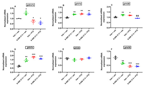 The effect of 6-GIN on (A) gabra1a, (B) grin1a, (C) grin2b, (D) gria1a, (E) gria2a, and (F) gria3b mRNA expression in PTZ-treated zebrafish larvae. After a 24 h incubation in 6-GIN (37.5 µM), zebrafish larvae were exposed to PTZ (20 mM) for 90 min. Next, zebrafish larvae were collected in a pool of n = 10/sample. mRNA levels were normalized against gapdh. Data were analyzed using one-way ANOVA with Tukey’s post hoc test. Data are depicted as a mean ± SEM (n = 3/group). *** p < 0.01, ** p < 0.01, * p < 0.05 vs. Veh + veh; && p < 0.01 vs. Veh + PTZ. 6-GIN—6-gingerol, PTZ—pentylenetetrazole, Veh—vehicle. n—refers to the total number of samples.