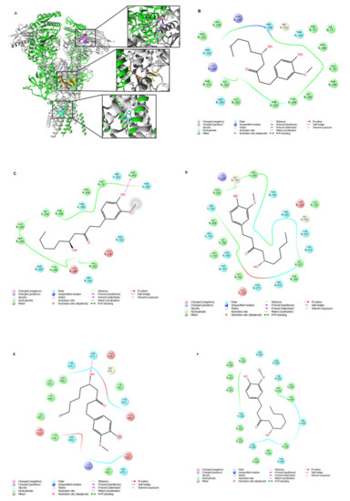 Molecular docking of 6-GIN to the GluN1/GluN2B NMDA receptor. (A) 6-GIN binding sites (surface model) are located at the ATD (magenta and purple), the LBD (yellow and orange) and the TMD (cyan) of the GluN1/GluN2B NMDA receptor. More specifically, molecular docking results suggested two different orientations of 6-GIN at ATD, a high-affinity site (magenta) located at the GluN1/GluN2B interface and a low-affinity site (purple) within the GluN2B subunit. In addition, 6-GIN may interact with the glutamate binding site (at the LBD). Orientation 1 presents a higher affinity site (orange) at the GluN1/GluN2B LBD interface, and orientation 2 presents a lower affinity pose (yellow) located within the LBD of the GluN2B subunit. Finally, the 6-GIN interacts within the ion channel (at the TMD) of the GluN1/GluN2B NMDA receptor. (B,C) 2D views of 6-GIN interacting with the high-affinity site and low-affinity site at the ATD, respectively. (D,E) 2D views of 6-GIN interacting with the higher-affinity as well as lower-affinity sites at the LBD, respectively. (F) 2D view of the 6-GIN interactions within the ion channel pore of the GluN1/GluN2B NMDA receptor. The GluN1 subunits are shown in green, and the GluN2B subunits are depicted in grey. The residues involved in 6-GIN binding are presented in panels (B–F) (2D views) and included in Table 1. Hydrogen bonds are marked with pink arrows, residues involved in hydrophobic interactions are shown in green, polar in blue, and charged residues involved in binding are shown in red.