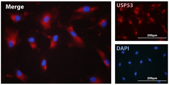 MC3T3-E1 cells were cultured on coverslips, fixed with 3.7% formaldehyde and permeabilized with 0.1% Triton X in PBS. The cells were blocked with 3% BSA for 45 min, and then incubated with rabbit anti-USP53 antibody (HPA035845, Sigma-Aldrich, Oakville, ON, Canada) in PBS with 1% BSA overnight at 4 °C. Then, cells were incubated with anti-rabbit Alexa Fluor–labeled secondary antibodies for 45 min at room temperature, and then mounted with Prolong Gold Antifade containing DAPI (Thermo Fisher Scientific, Waltham, MA, USA). Images were acquired on a Leica DMR fluorescence microscope (Leica Microsystems, Richmond Hill, ON, Canada) connected to a digital DP70 camera (Olympus, Bethlehem, PA, USA).