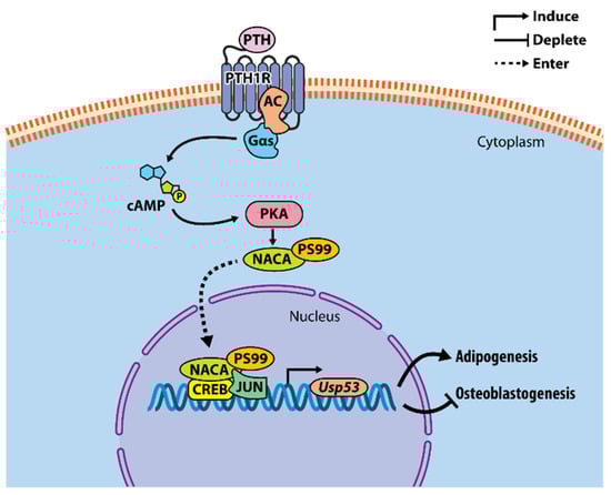 So far, our working model depicts Usp53 as a transcriptional target of the iPTH-PKA-NACA pathway in osteoblasts. PTH-activated NACA translocates to the nucleus following phosphorylation at serine residue 99 along with CREB and JUN to potentiate the transcription of Usp53. The knockdown of Usp53 in mesenchymal cells enhances osteoblastogenesis and impairs adipogenesis [74]. The mechanism of action by which Usp53 modulates mesenchymal cell commitment and differentiation is yet to be uncovered (Figure 2).