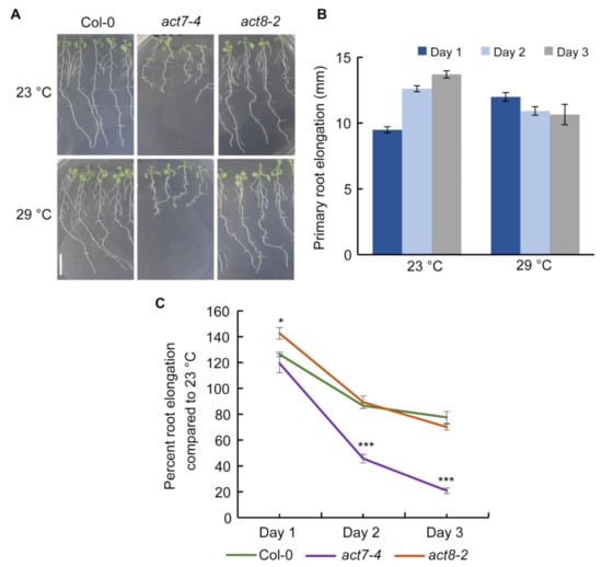 Effect of prolonged moderate-high temperature on root elongation of Col-0, act7-4, and act8-2 mutants. (A) Phenotype of primary root elongation of Col-0, act7-4, and act8-2 for 3 consecutive days at 23 °C and 29 °C. Root elongation was marked after every 24 h (Scale bar = 10 mm). (B) Primary root elongation of Col-0 for 3 consecutive days at 23 °C and 29 °C. (C) Primary root elongation of Col-0, act7-4, and act8-2 in percentage for 3 consecutive days. Percentage root elongation at 29 °C is calculated against the root elongation at 23 °C for each genotype. Five-day-old seedlings were transferred to new agar plates and subjected to high-temperature treatment (29 °C) and control temperature (23 °C) for 3 days under light condition. Vertical bars represent mean ± SE of the experimental means from at least three independent experiments. Asterisks represent the statistical significance as judged by the Student’s t-test (* p < 0.05; *** p < 0.001).